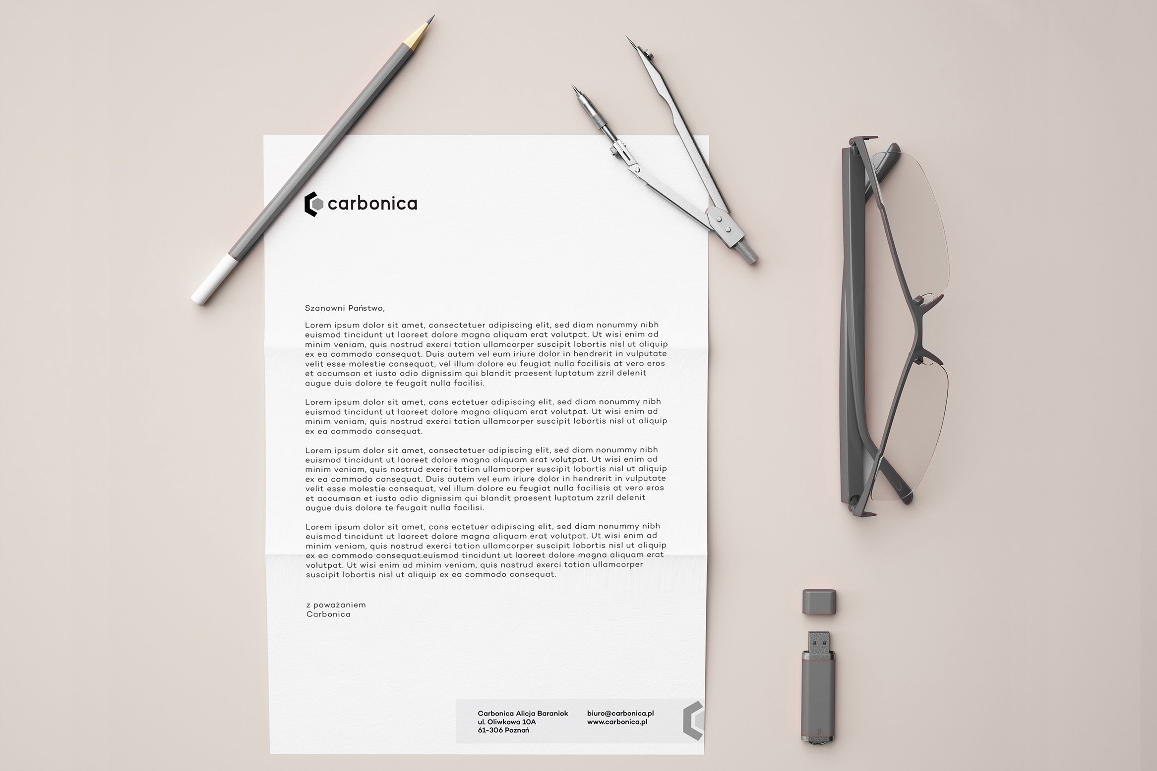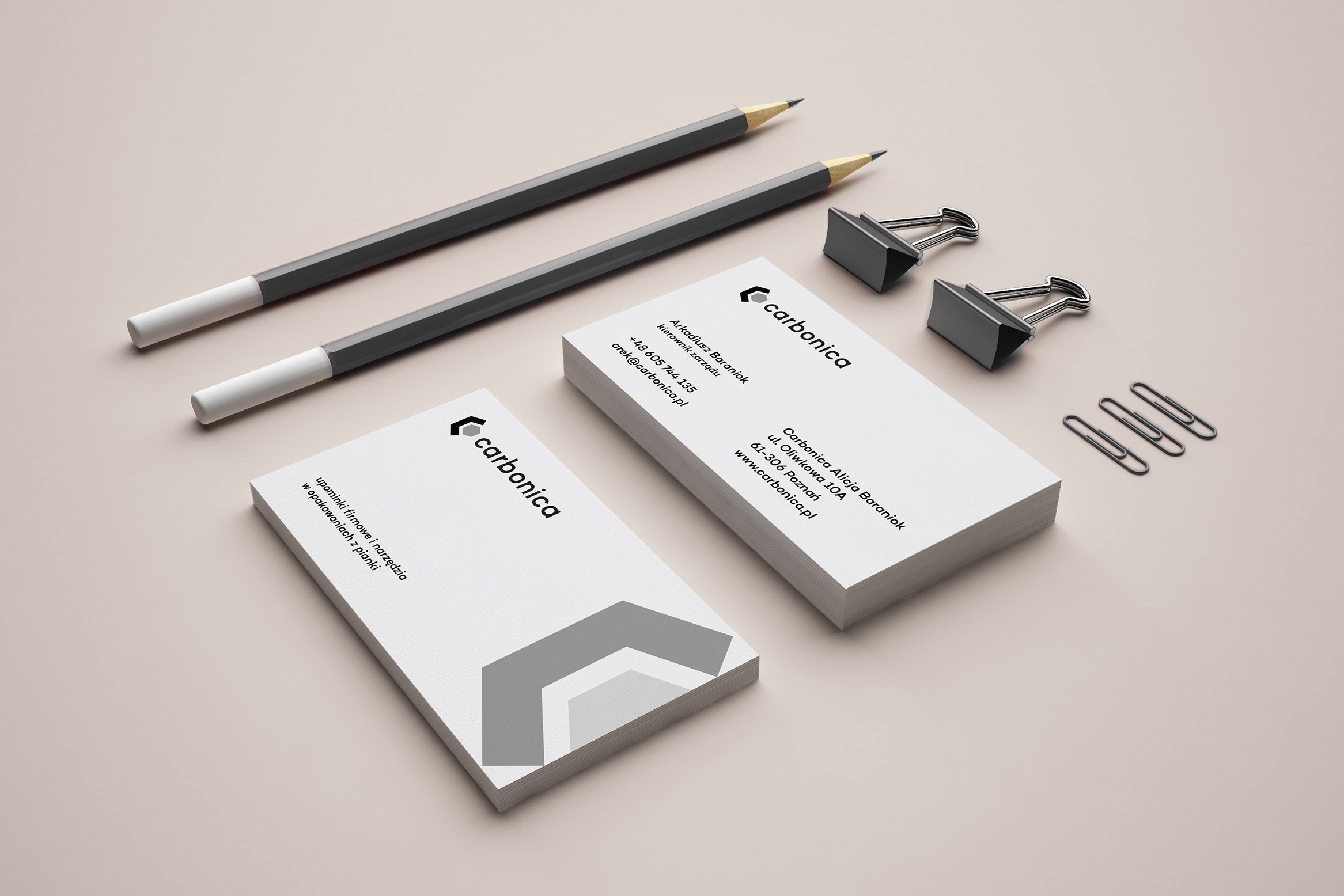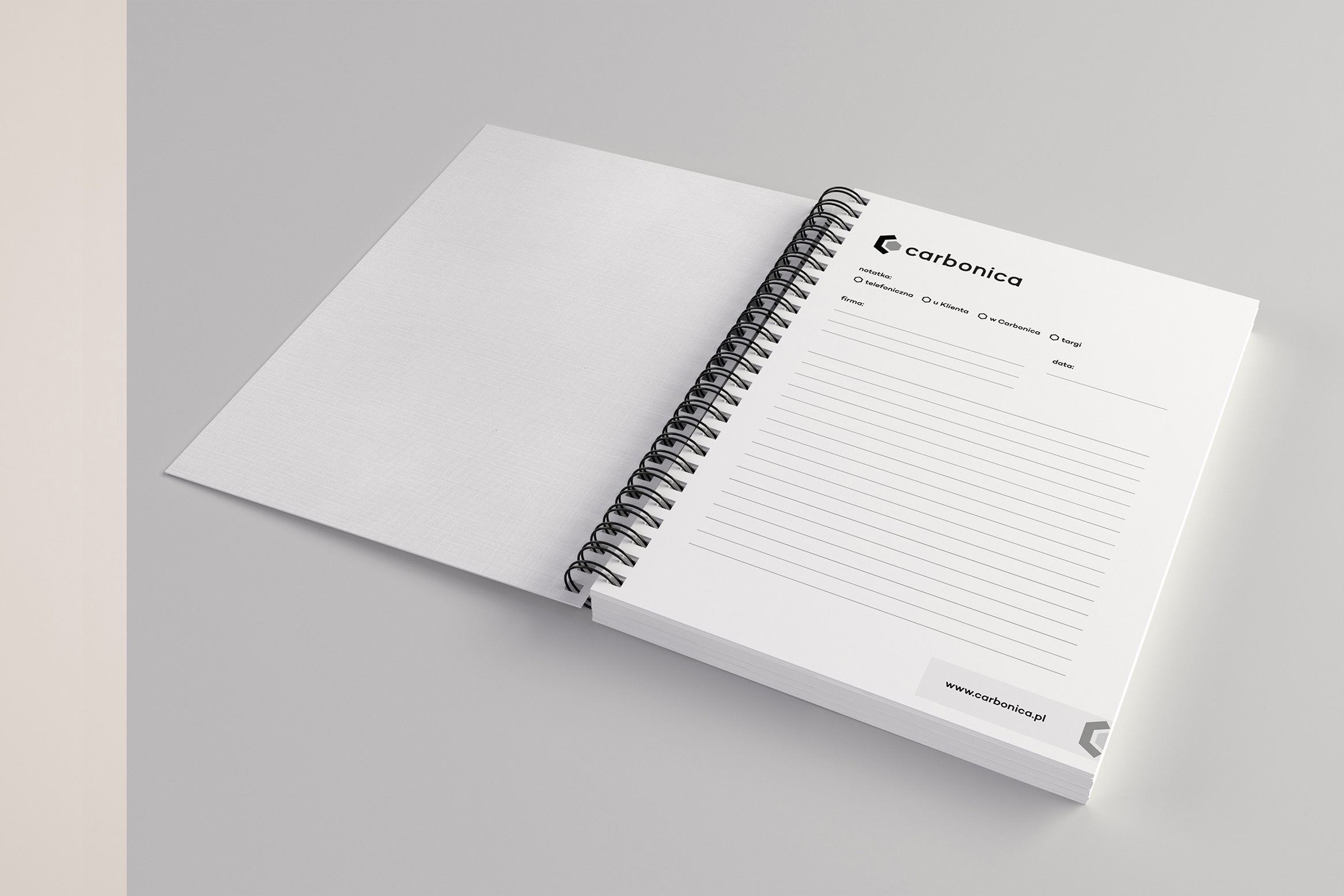 Dla Carbonica stworzyliśmy nowoczesny i kontrastowy znak, nawiązujący do struktury włókna węglowego. Oprócz samego logo zaprojektowaliśmy też papier firmowy i notatnik.